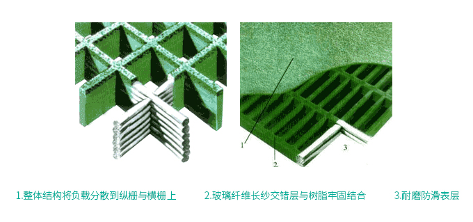 其頂端具有硅質磨粒的防滑層,內在交錯編制結構,整體成型將負載分布在縱向柵條和橫向柵條上,使之具有較高的強度和負載能力。